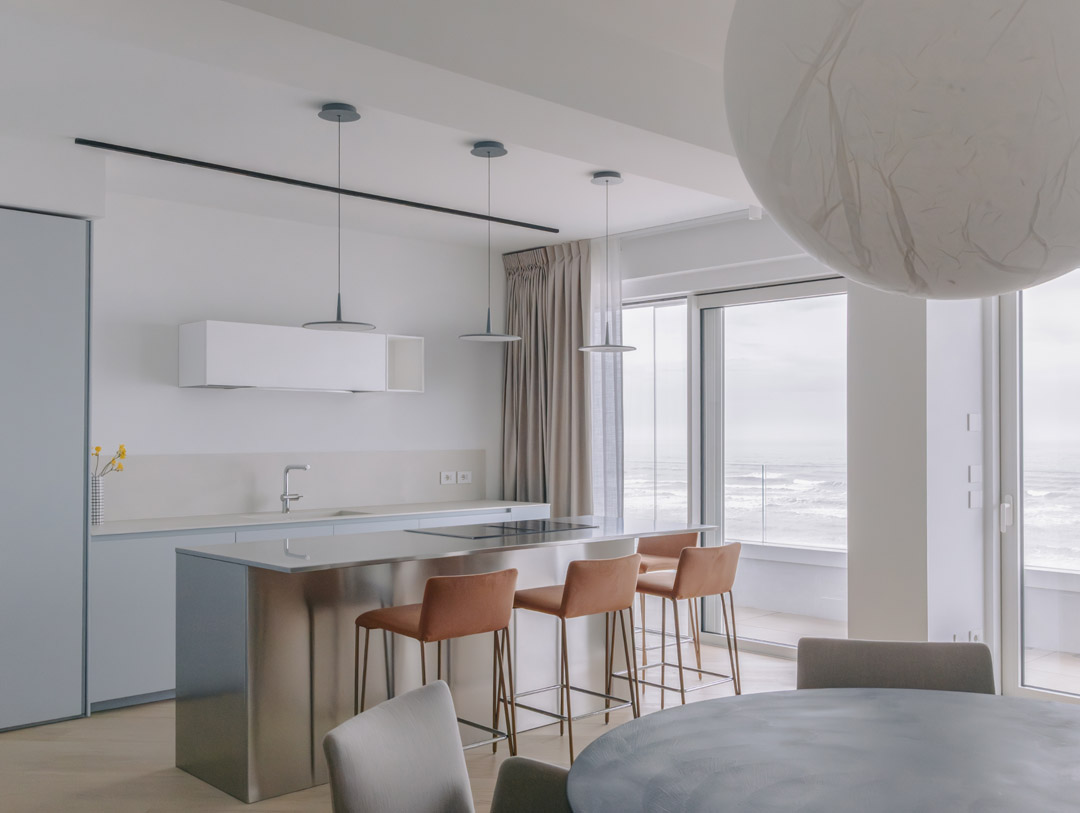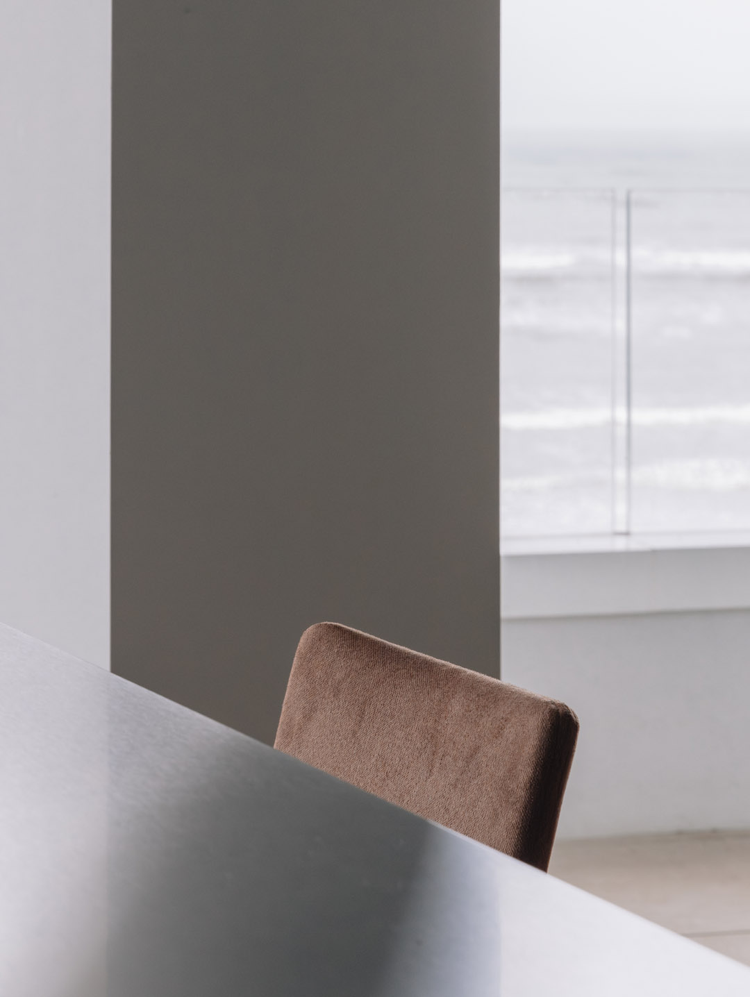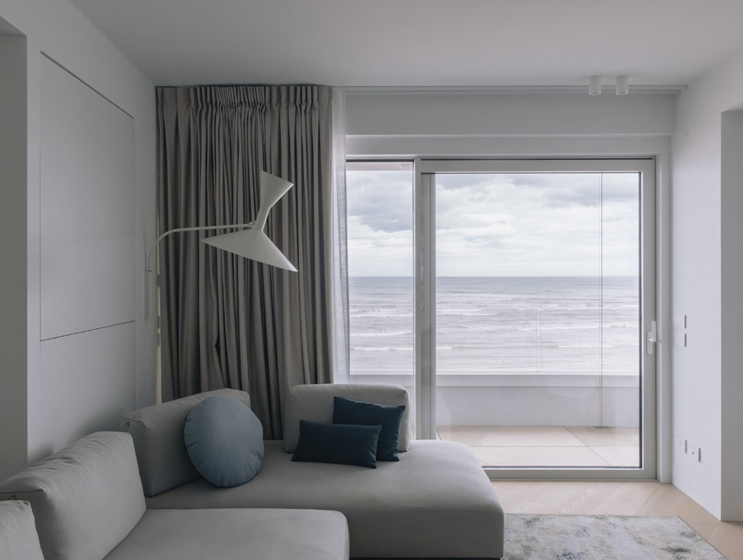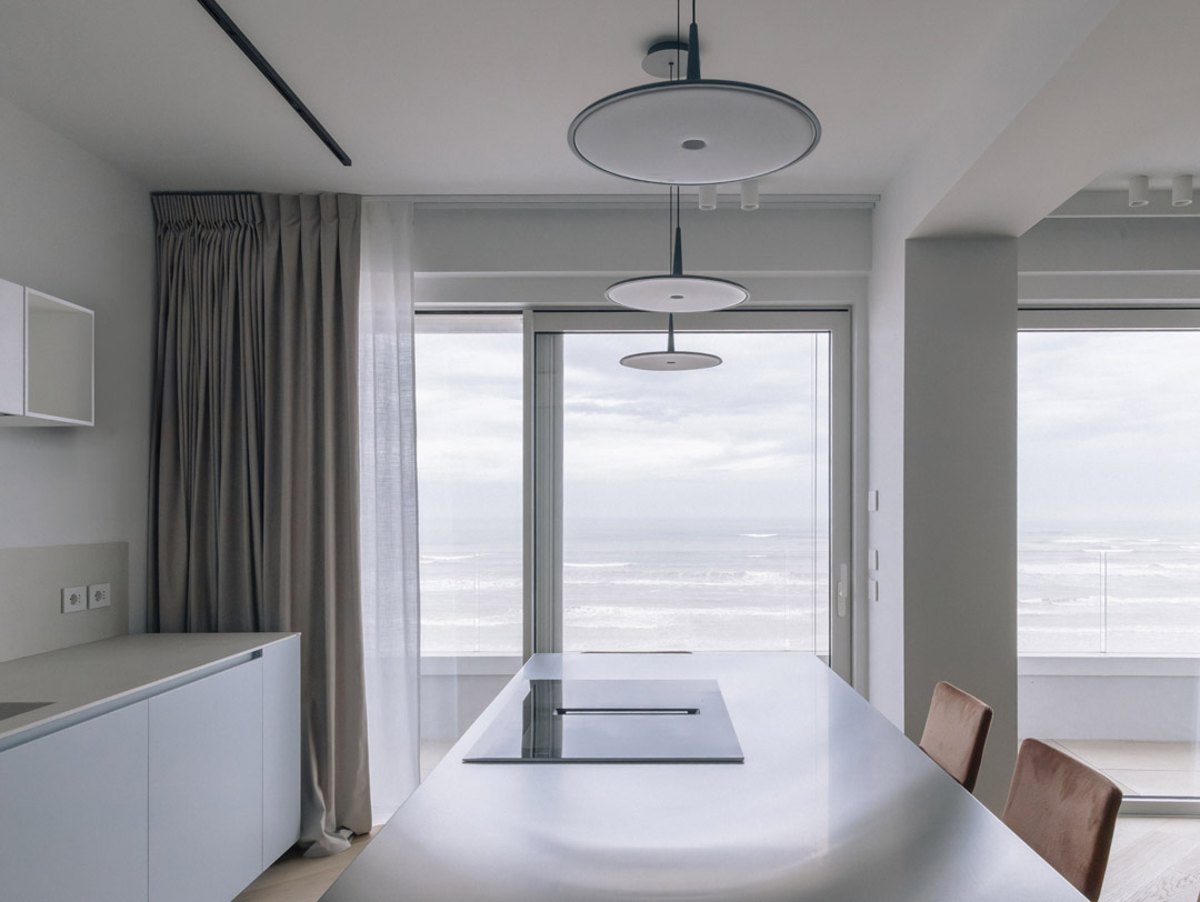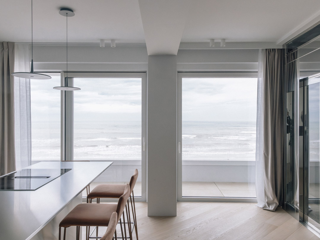 Non soltanto un luogo in cui abitare, ma anche la fotografia di un dialogo tra interno ed esterno dove il mare risulta protagonista. Importanti superfici vetrate permettono una vista costante sull’Adriatico dall’interno dell’abitazione.