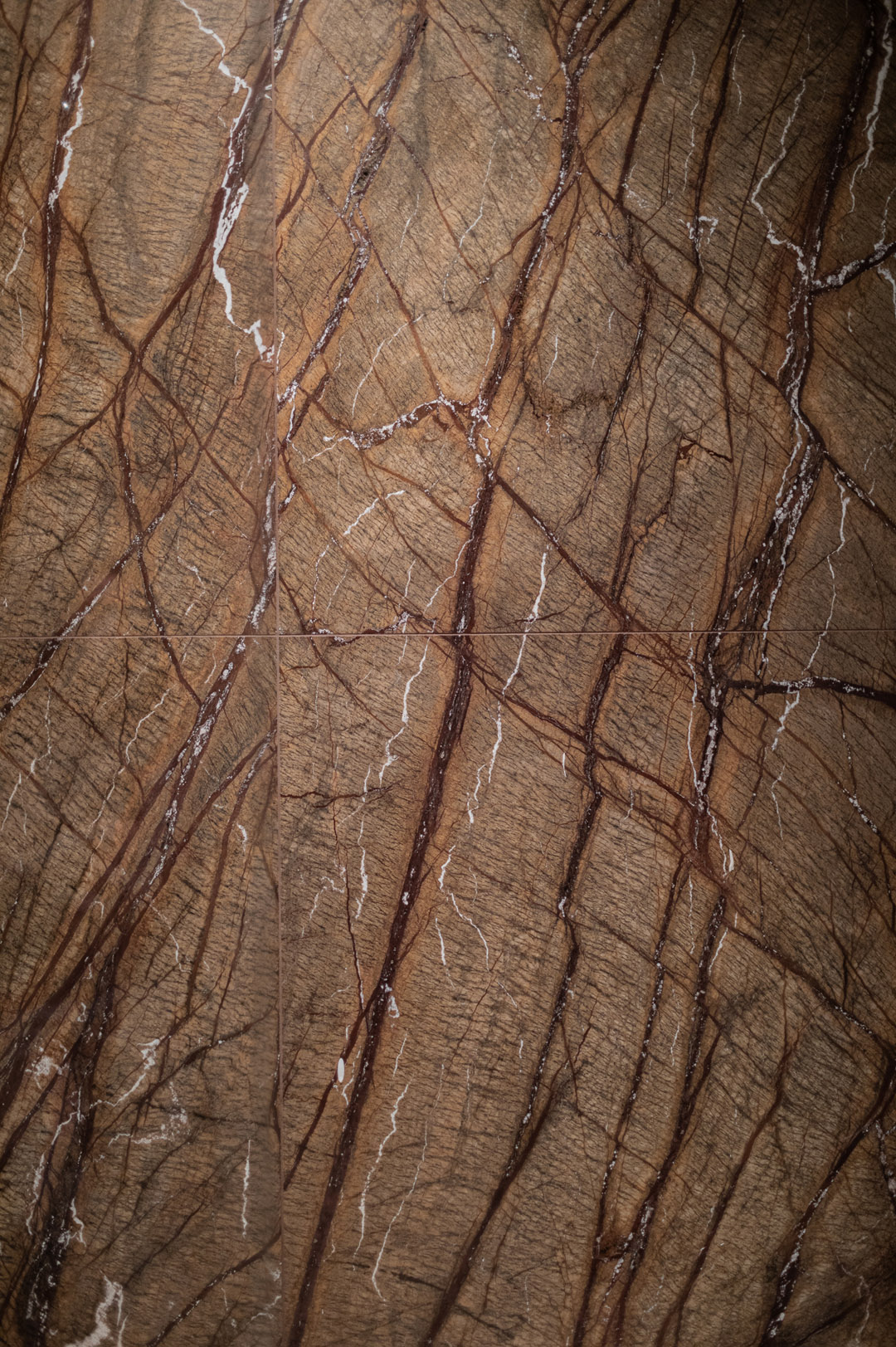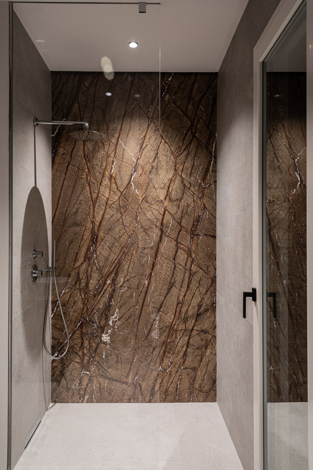 Zona notte molto calda e intima, gli eleganti bagni speculari si distinguono per un rivestimento parete doccia in Marmo Picasso Brown a tutt’altezza.