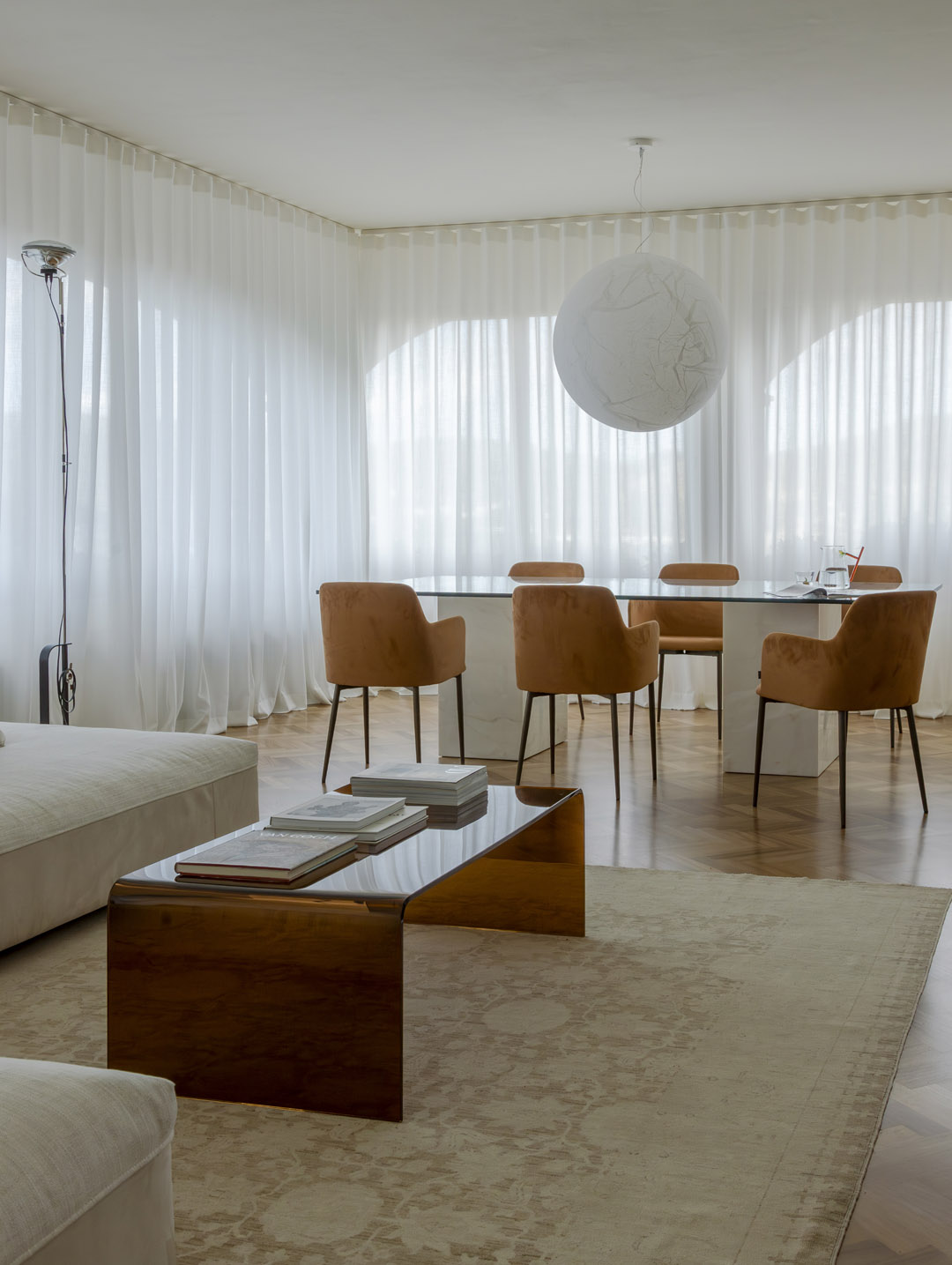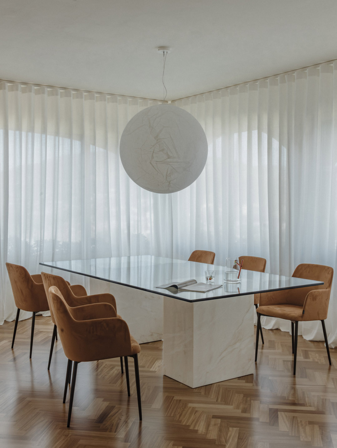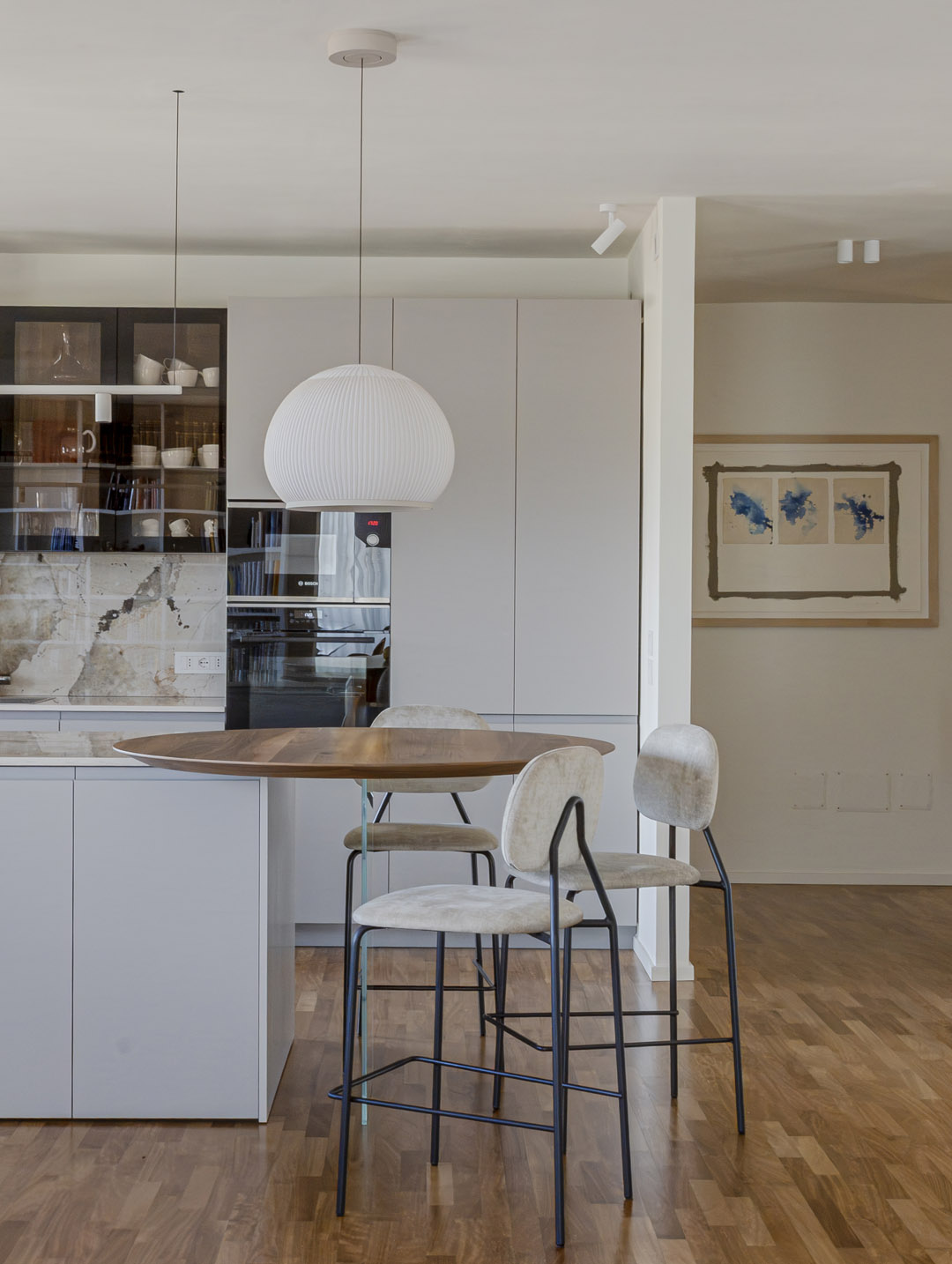 La luce naturale posa sui volumi esaltandone i dettagli, la materia è presente in maniera decisa ma non invasiva, il design risiede in ogni angolo.