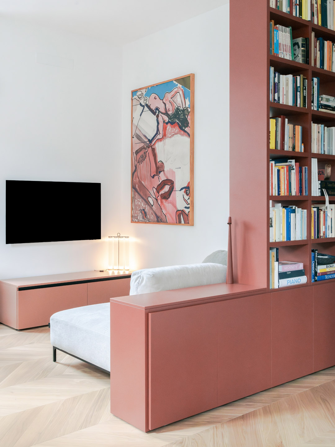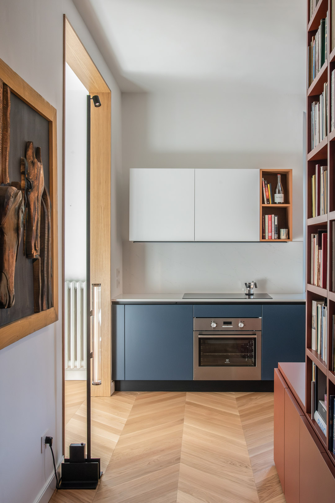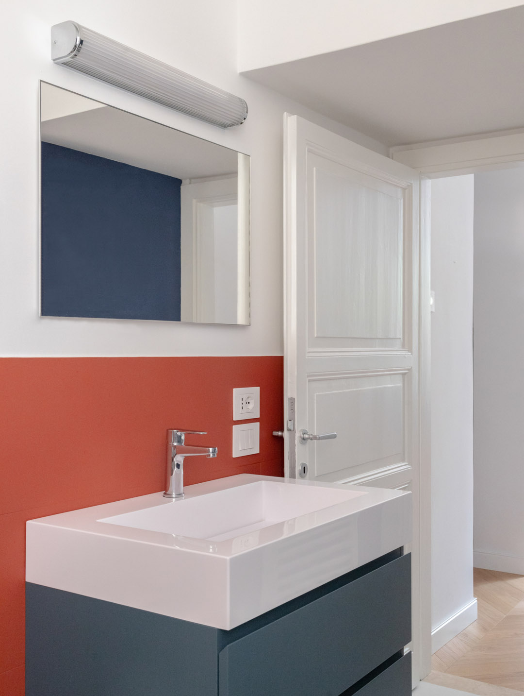 A terra una Spina Francese in rovere naturale senza tempo; i volumi invece che salgono verticali con toni pastello come blu oceano, rosso mattone e cuoio donano colore ed eleganza all’ambiente definendo al tempo stesso gli spazi.
