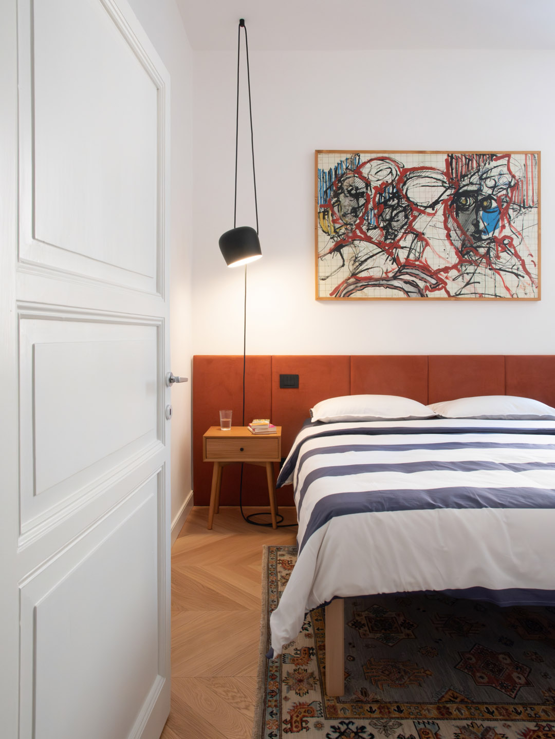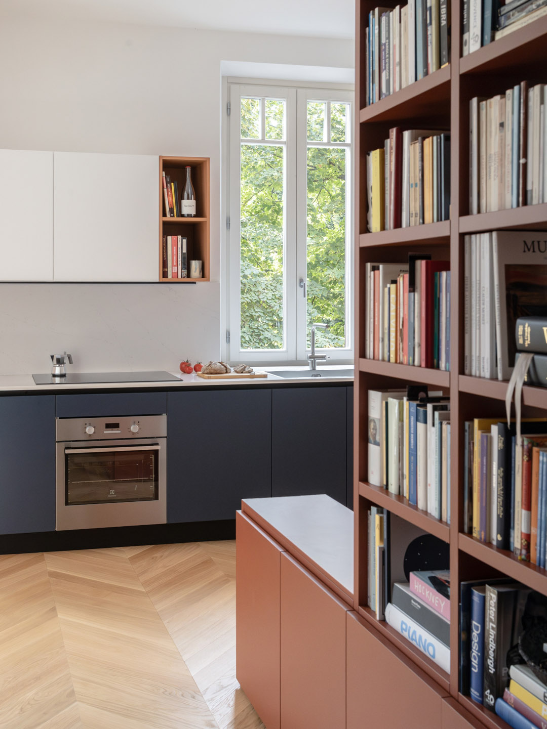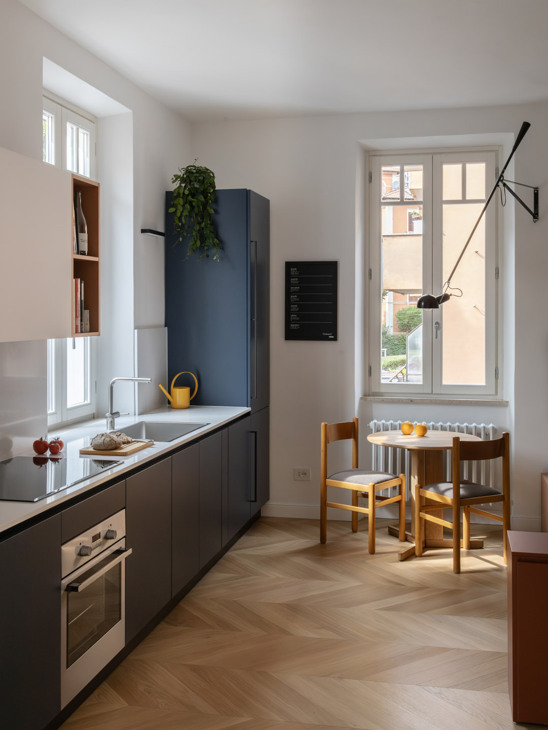 A terra una Spina Francese in rovere naturale senza tempo; i volumi invece che salgono verticali con toni pastello come blu oceano, rosso mattone e cuoio donano colore ed eleganza all’ambiente definendo al tempo stesso gli spazi.
