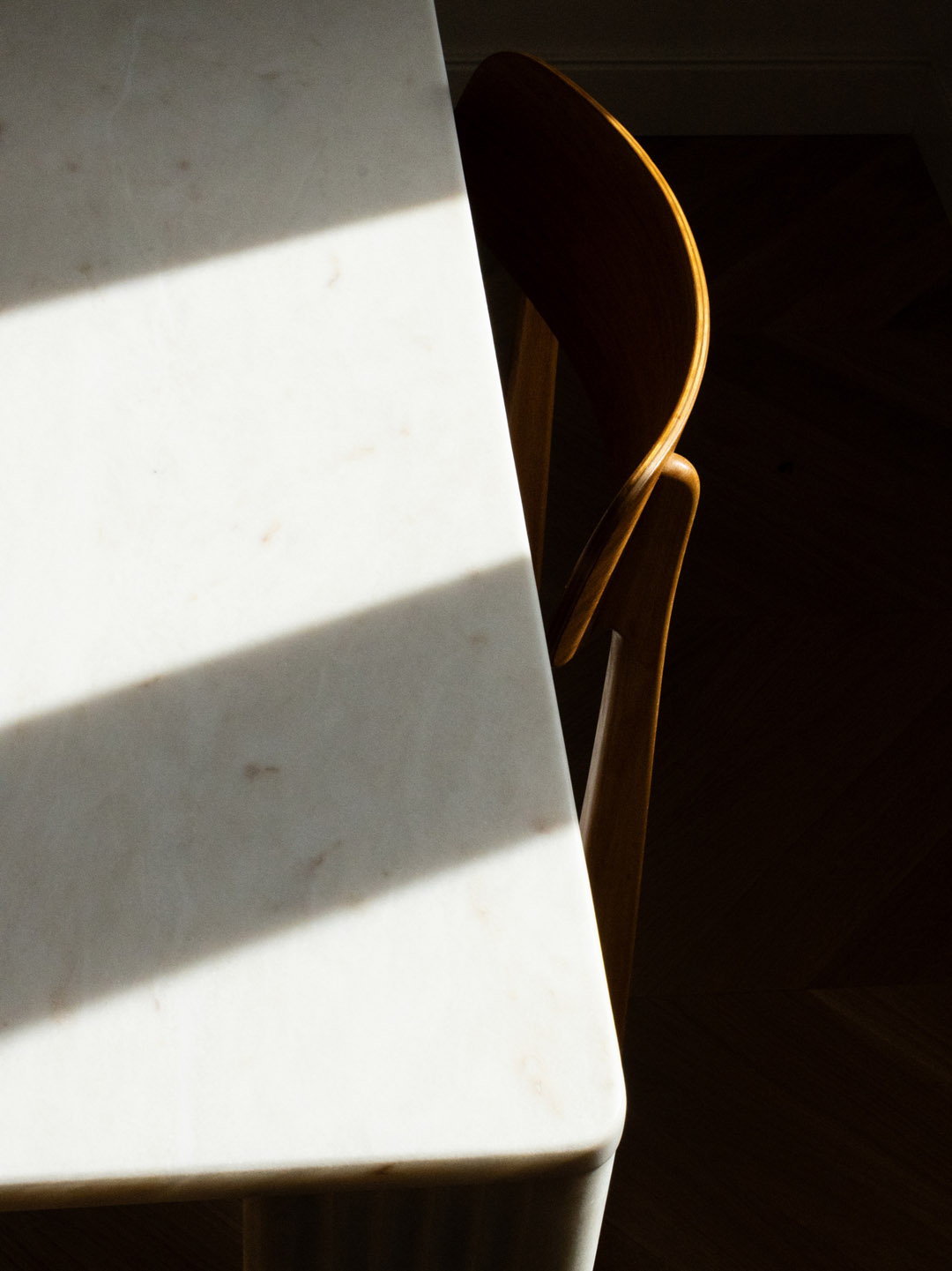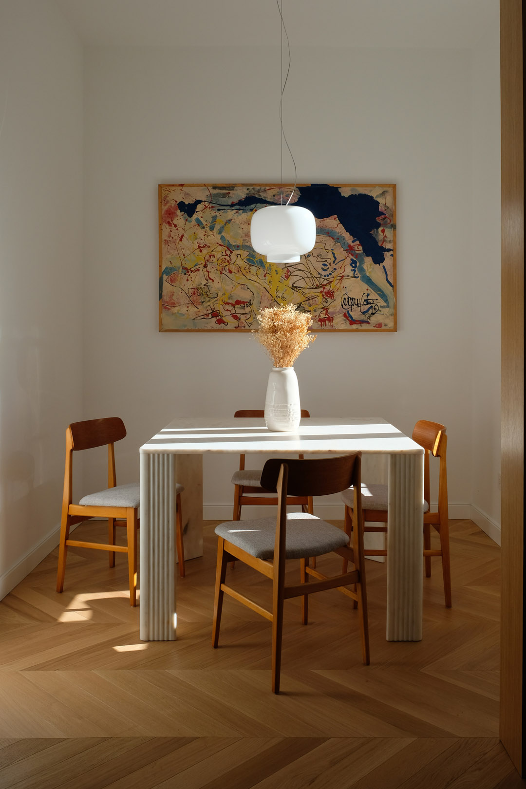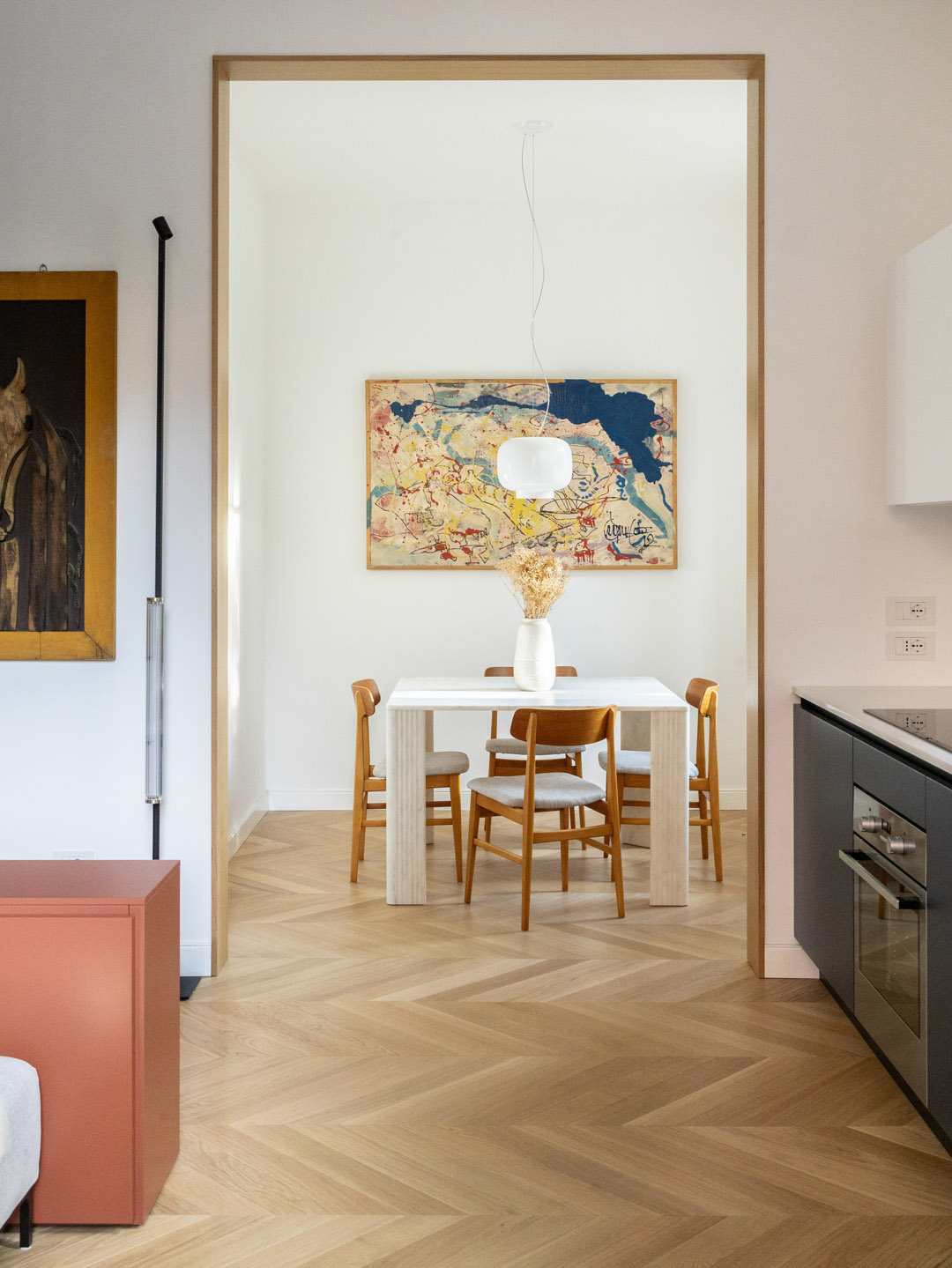 Una parete portante è stata rimossa per creare un varco a tutt’altezza che portasse all’interno di una contenuta sala pranzo comunicante con il living, dove il protagonista è “Necessario”: un tavolo artigianale in Marmo Rosa Portogallo realizzato su misura.