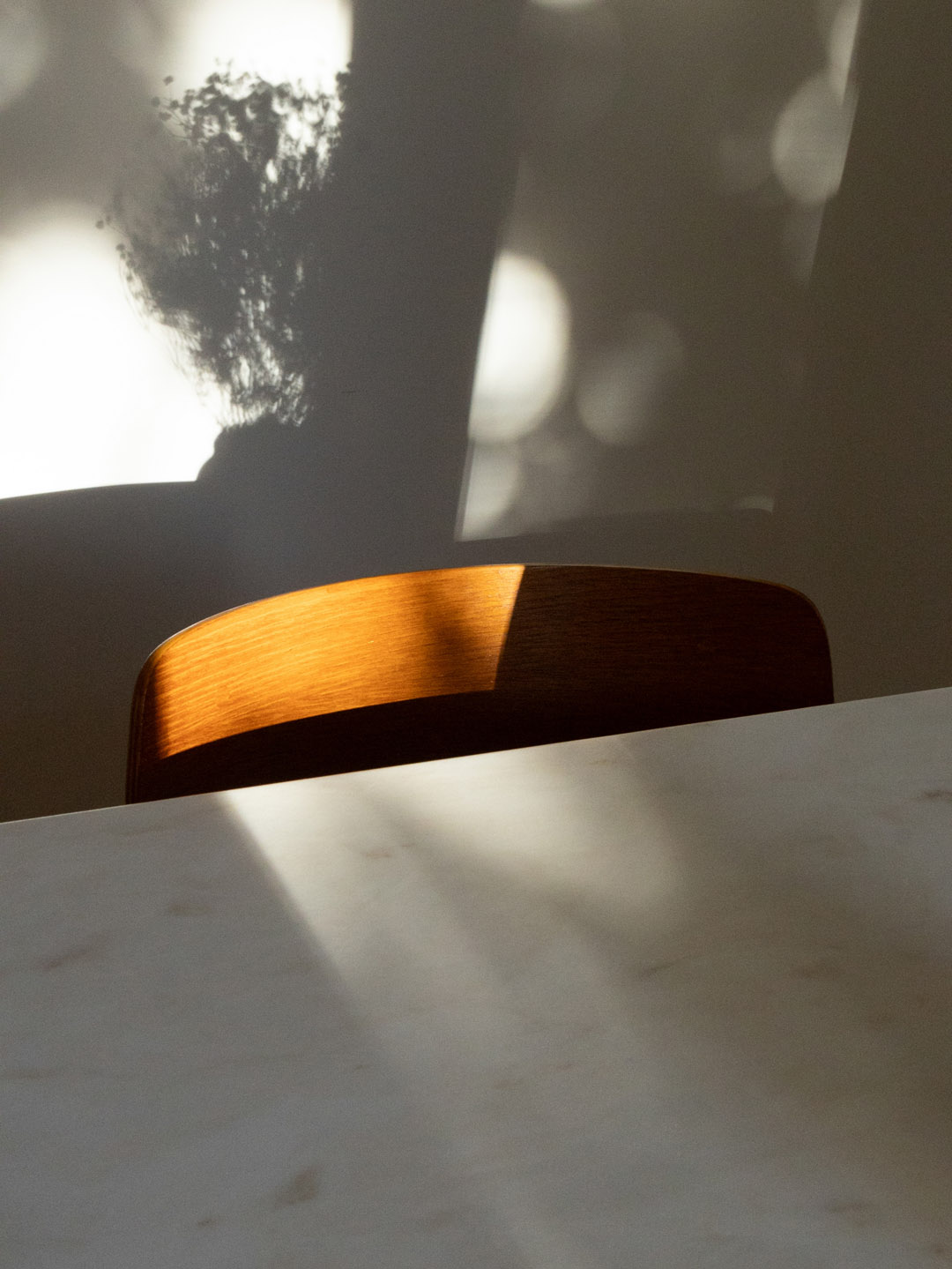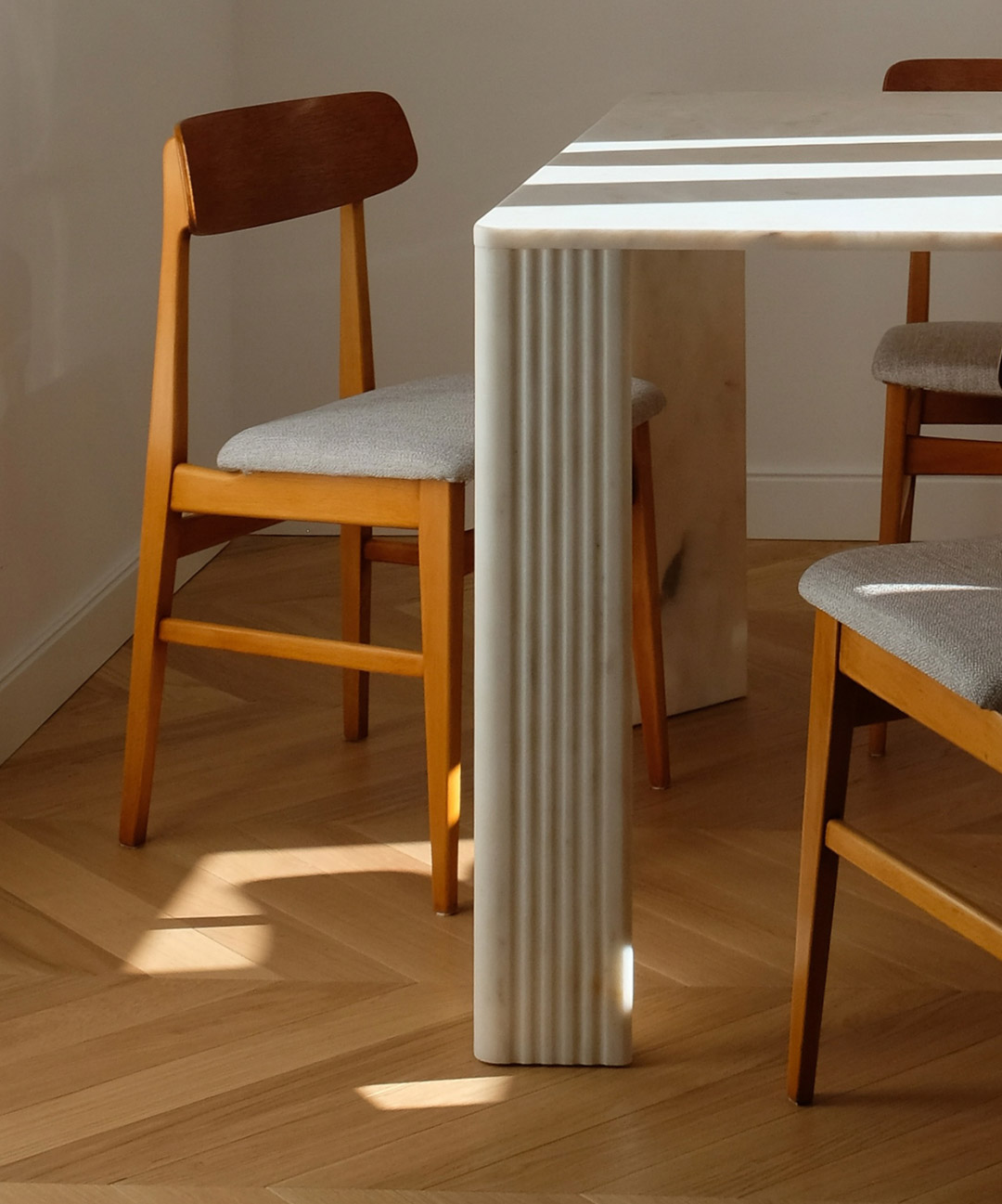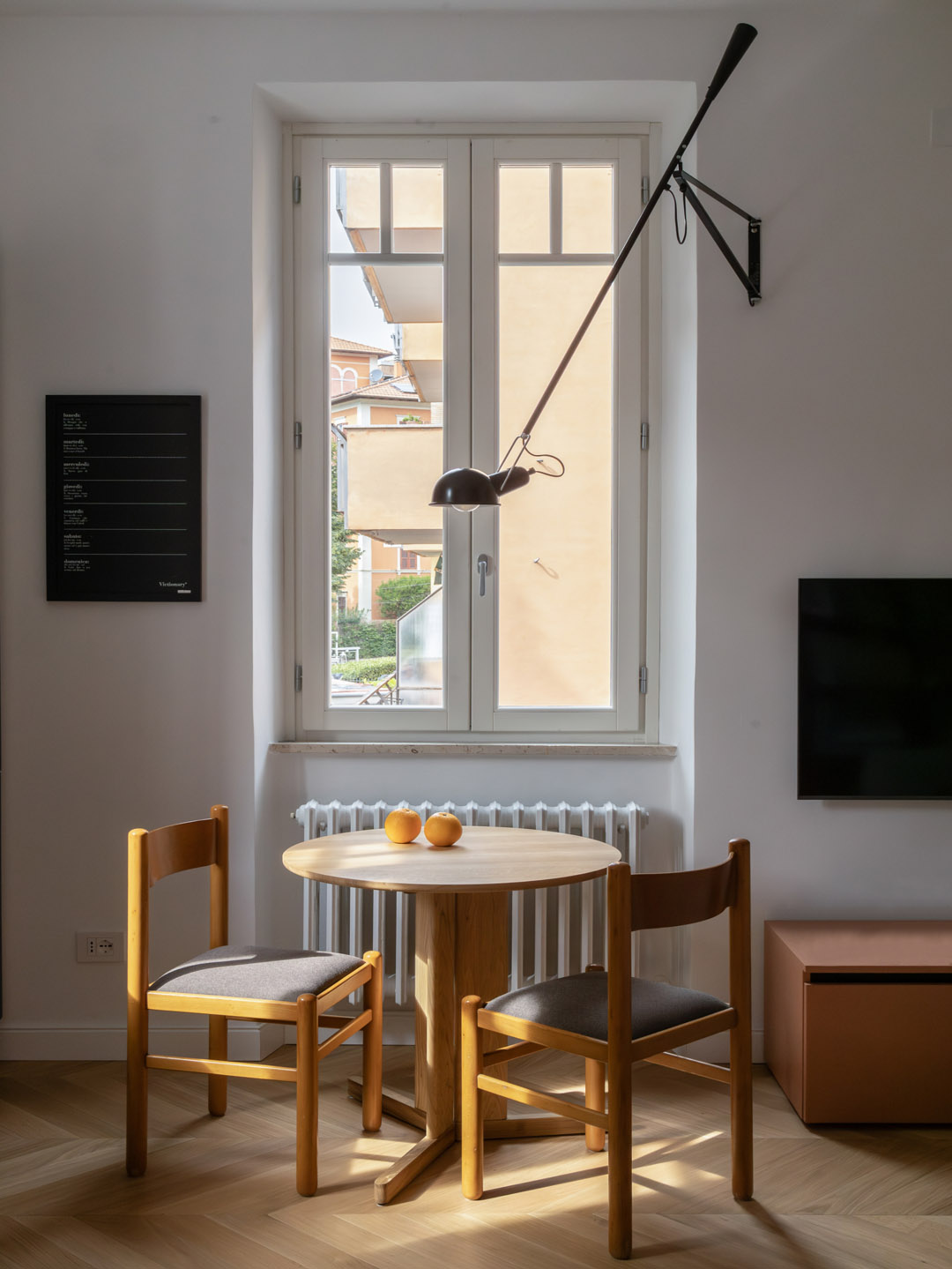 Una parete portante è stata rimossa per creare un varco a tutt’altezza che portasse all’interno di una contenuta sala pranzo comunicante con il living, dove il protagonista è “Necessario”: un tavolo artigianale in Marmo Rosa Portogallo realizzato su misura.