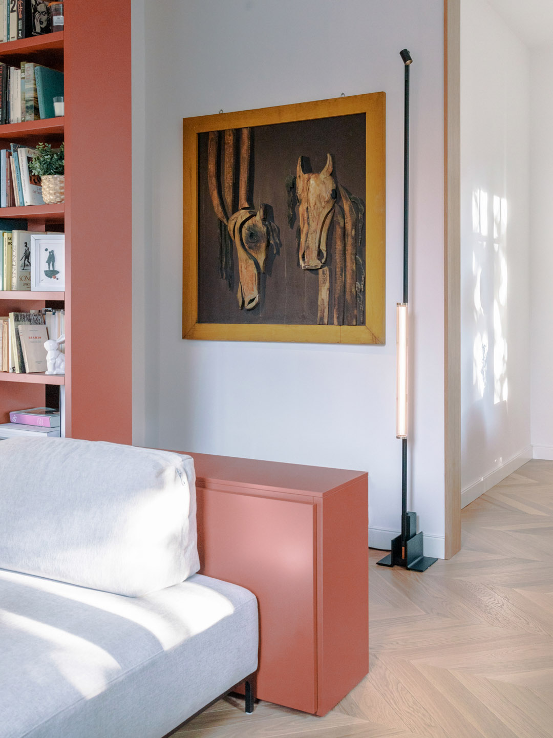 Il progetto presenta un filo logico in cui l’occhio percepisce un susseguirsi di colori, finiture e texture che spesso si ripetono in ogni ambiente. Forma e personalità in questo appartamento vengono completate da opere d’arte con dimensioni importanti e da punti luci che spaziano dall’iconico al tecnico mantenendo sempre un loro bilanciamento.